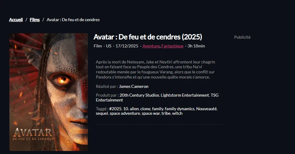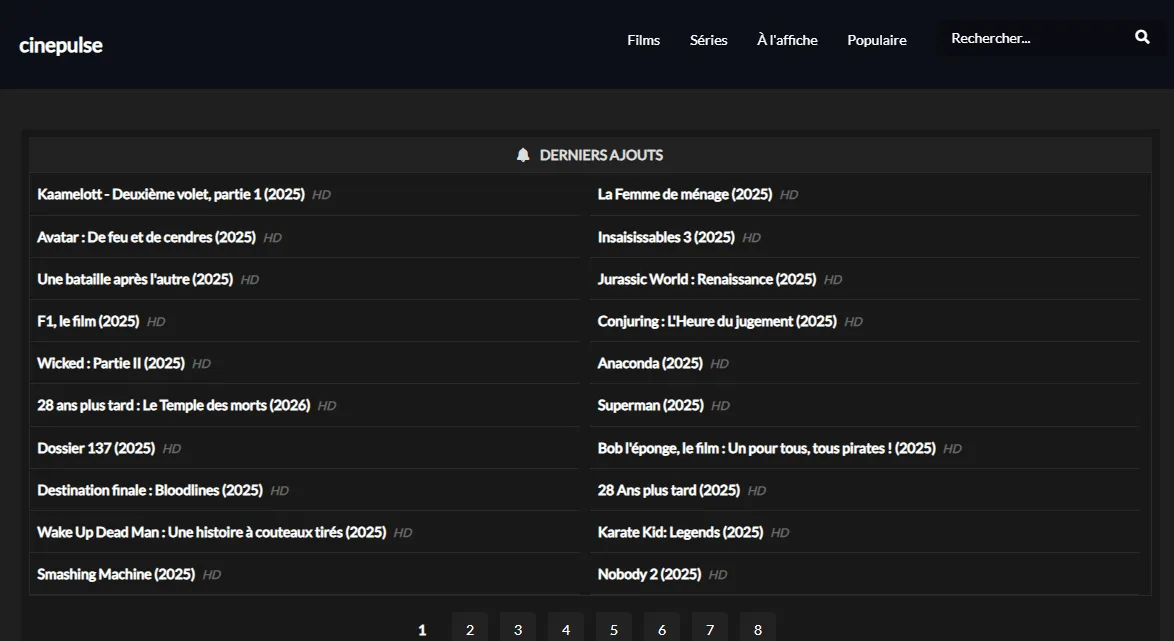 Cinepulse mise sur une interface claire, pensée pour faciliter la navigation. Les catégories sont bien définies, le moteur de recherche est rapide, et les contenus sont présentés de manière lisible, avec affiches, synopsis et informations essentielles.
